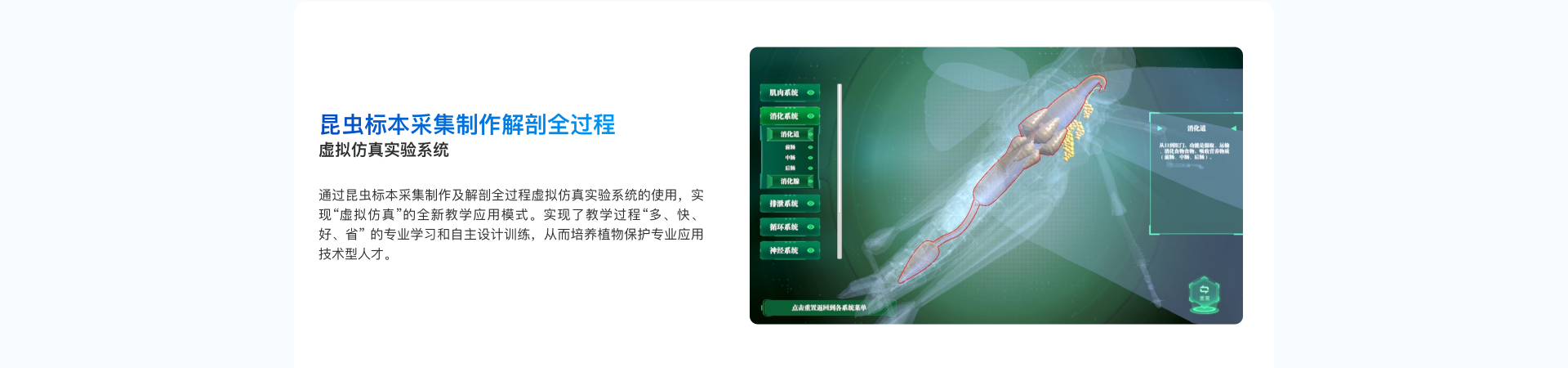 畜牧兽医虚拟仿真实训综合解决方案利用VR/AR、虚实结合、人工智能等技术,构建模拟畜禽养殖环境、疫病诊断、繁殖育种等全流程场景。实训内容匹配动物养殖、动物解剖、动物医学、动物繁殖等核心专业课程。学生可在虚拟环境中安全开展养殖实操、疾病鉴别与防治等训练,突破时空限制,降低实训成本与风险;方案还支持多人协同操作、数据实时反馈与考核评估,助力院校培养适应产业发展的高素质畜牧人才,推动教学与产业需求深度融合。